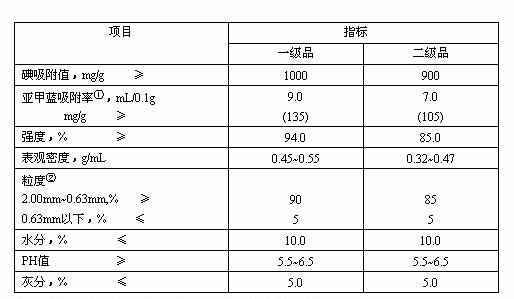 我国“糖液脱色用活性炭”的国家标准(GB/T13803.3-1999)规定,活性炭产品分为优级品、一级品和二级品三种。其水分都低于10%;焦糖脱色率分别高于100、90和80,灰分分别低于3%、4%和5%(用磷酸法生产的活性炭可在7%~9%,不分等级),酸溶物分别低于1%、1.5%和2%,还有铁含量和氯含量的规定。它们的pH值都在3~5之间。